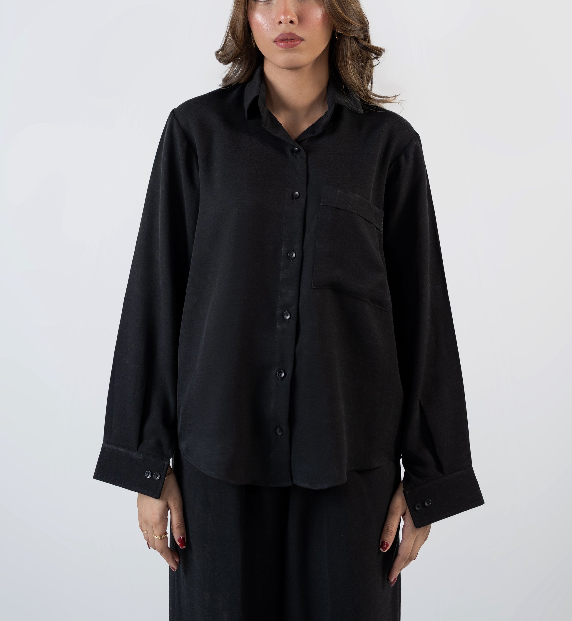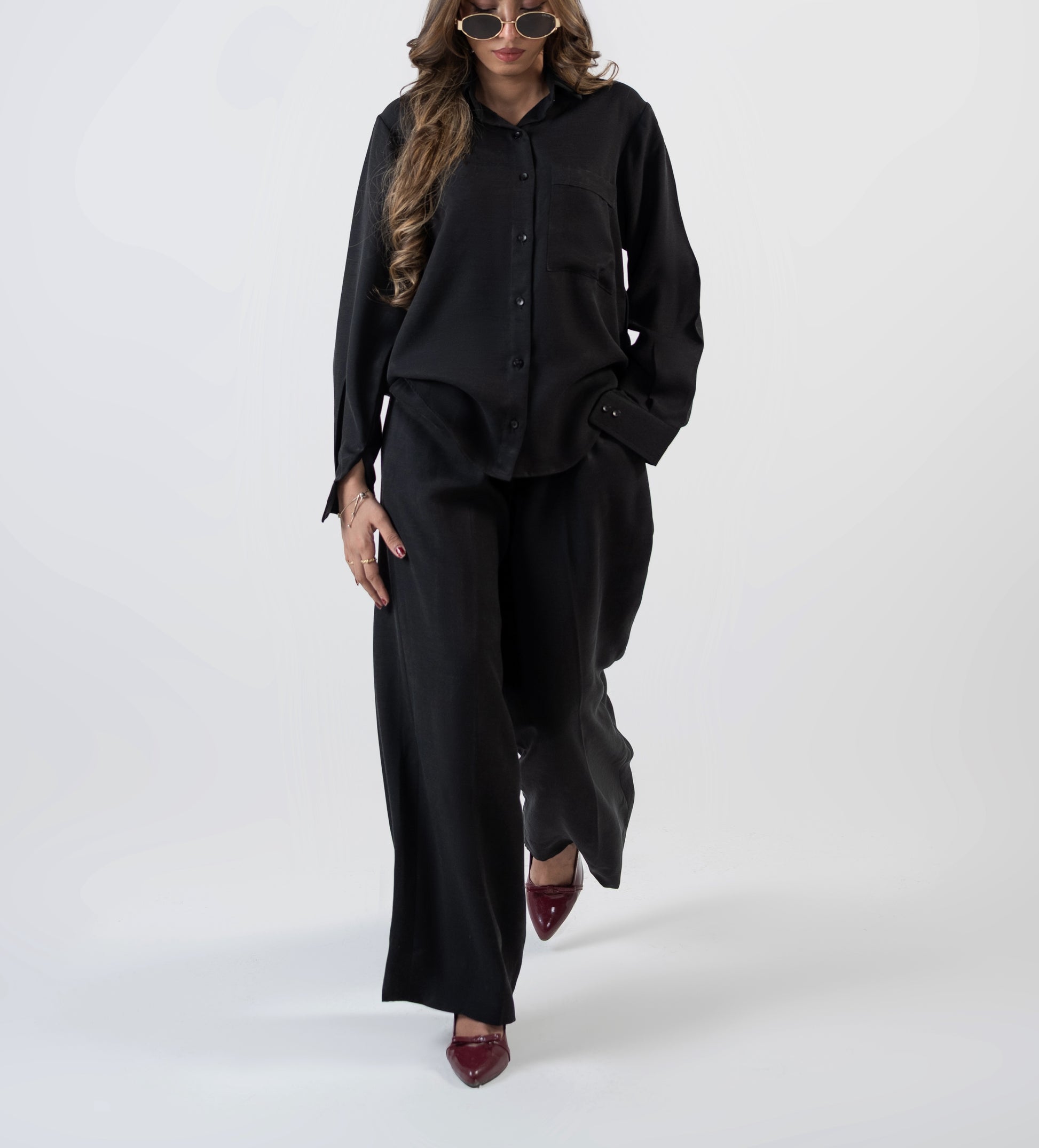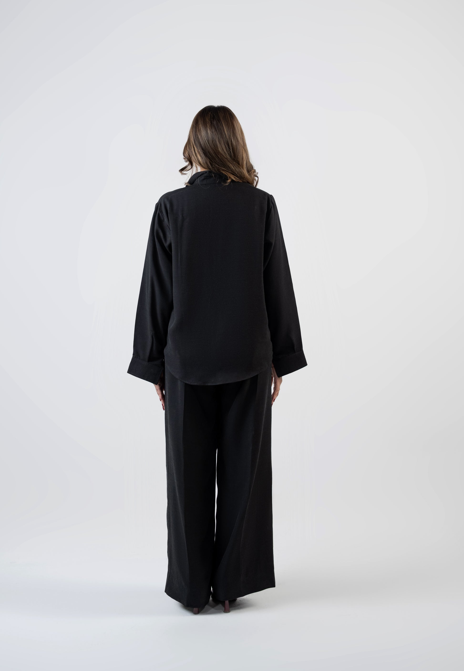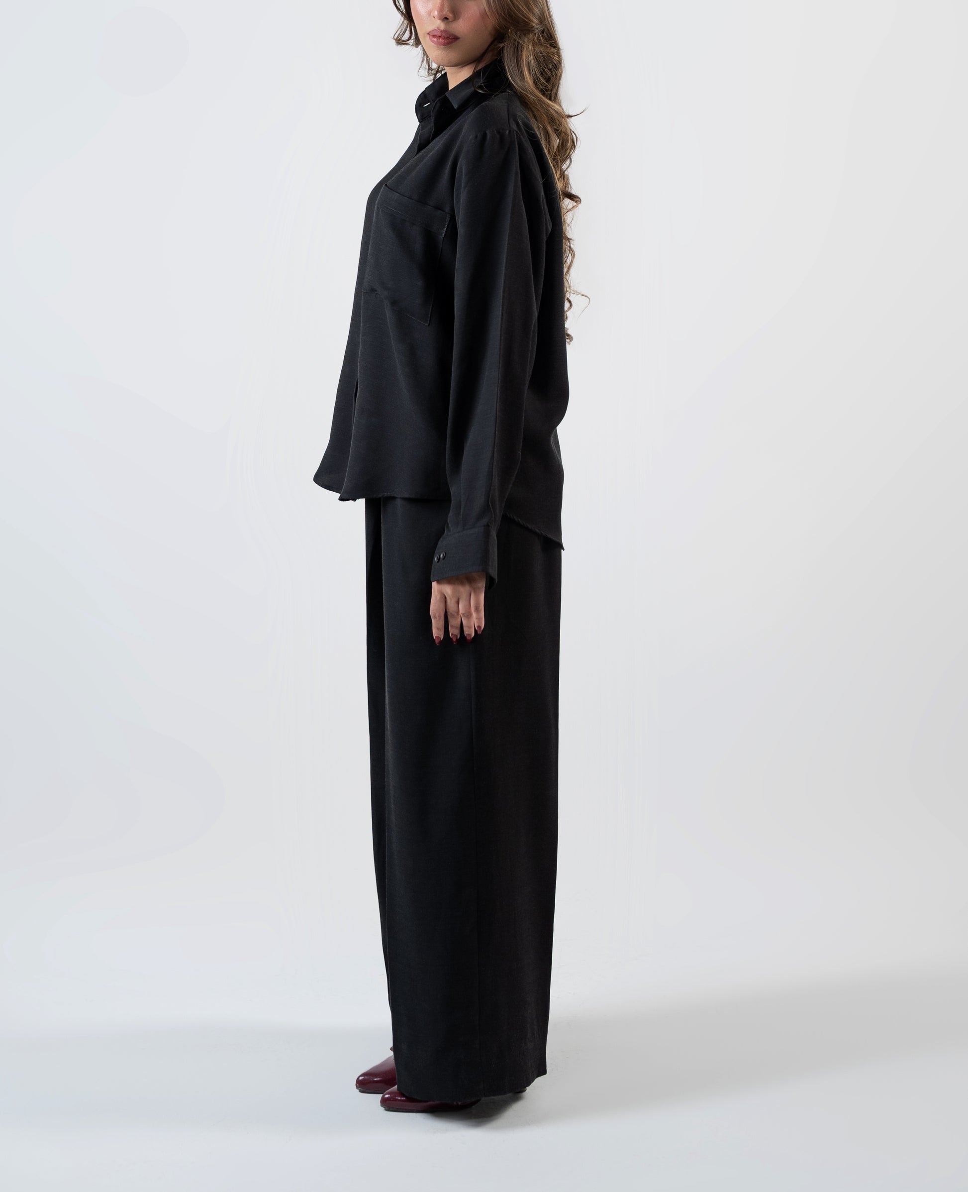 Design Detail: 2 Piece, button down shirt and high waist trousers with half elasticated waistband, front belt, with side pockets