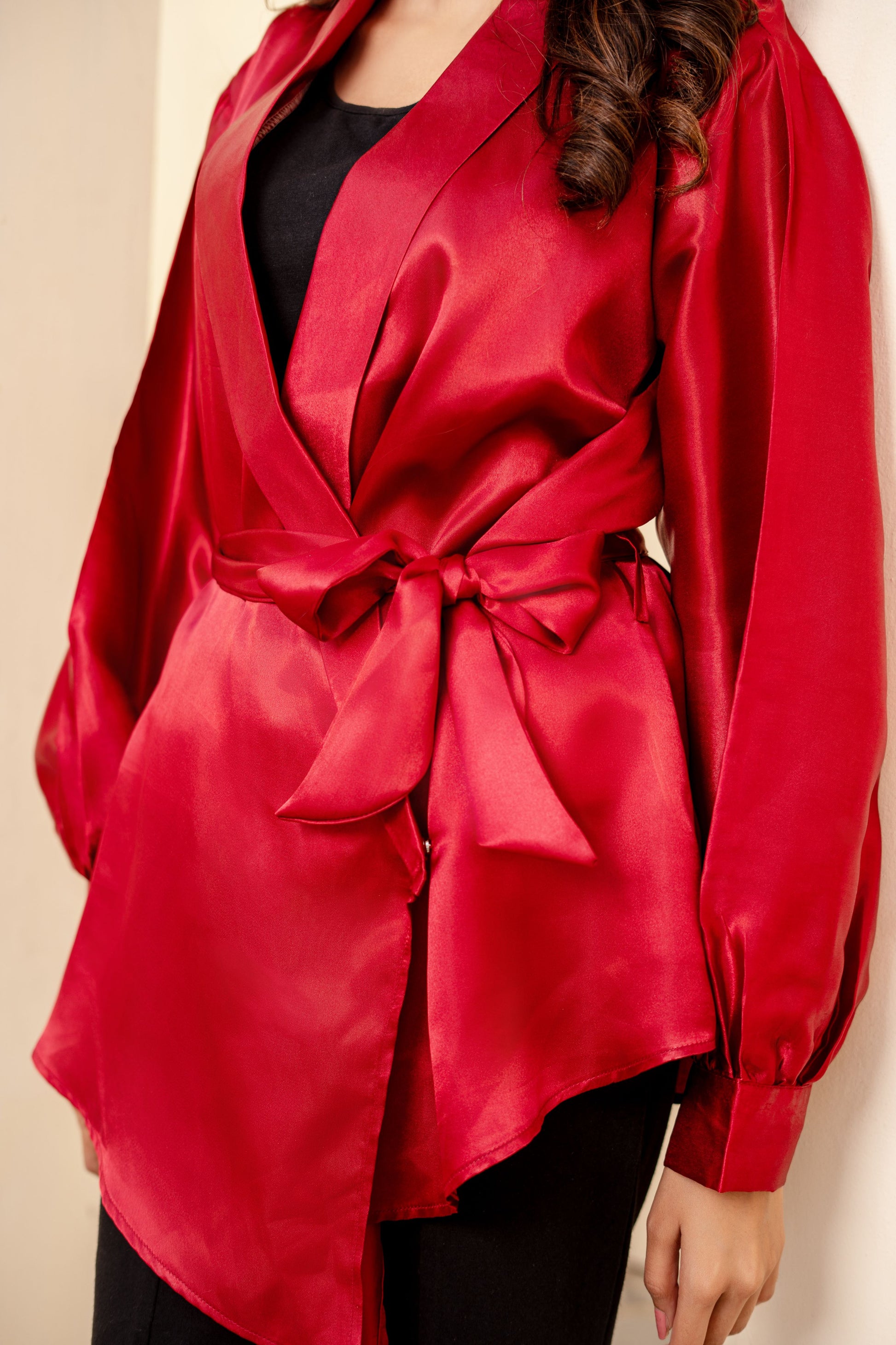 Design Detail: Silk top with a collar. Featuring front open and belt.