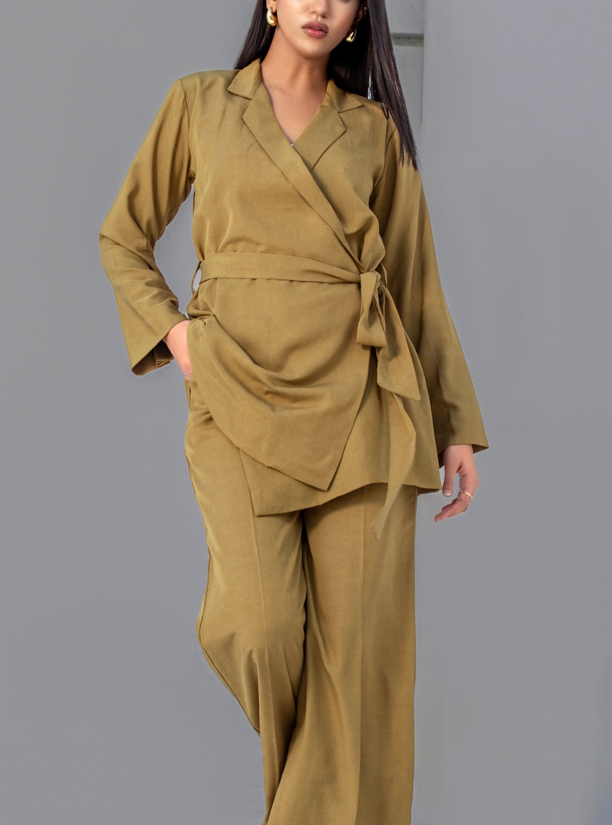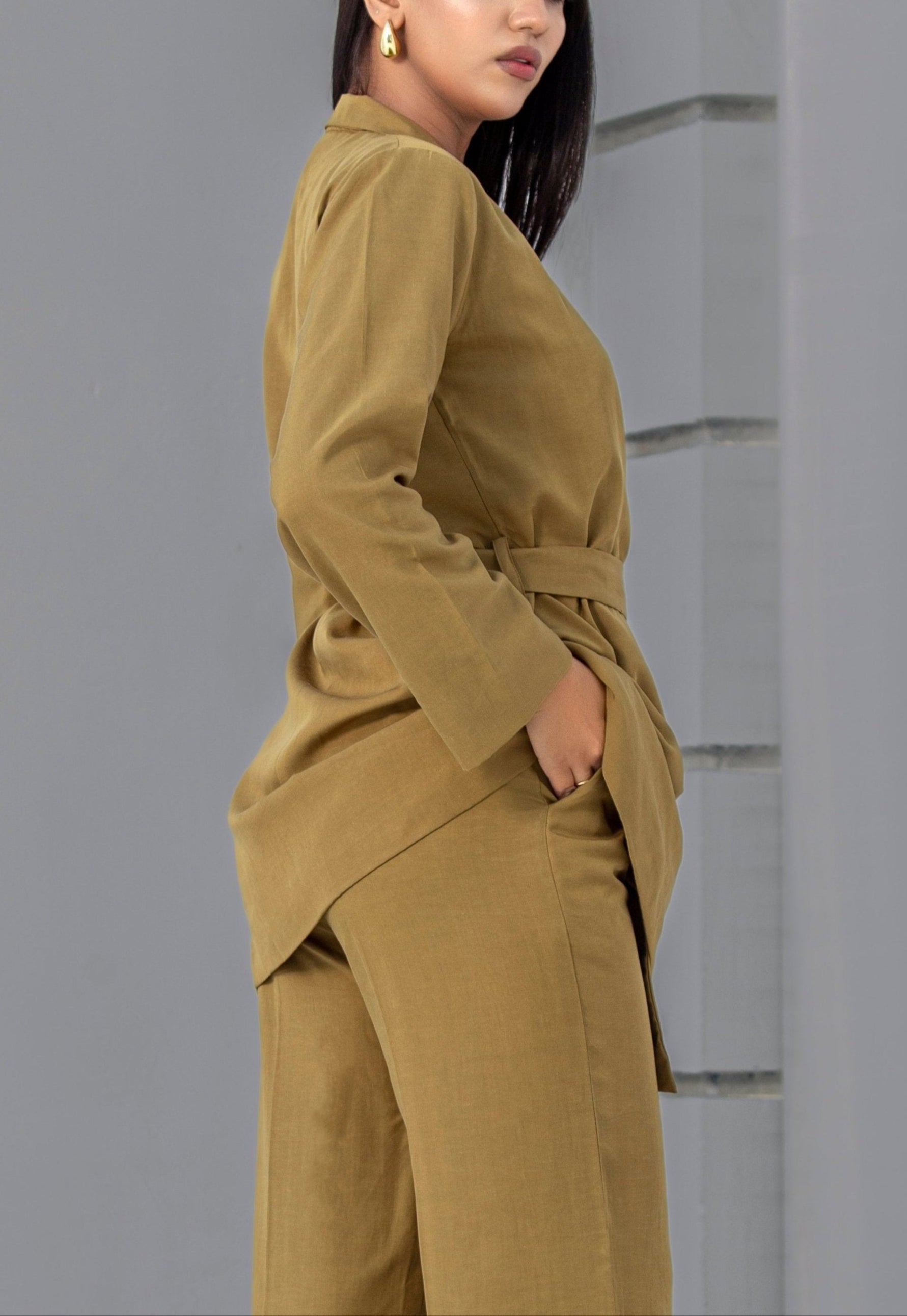 Design Detail: Blazer with Belt and Pants with Pockets.