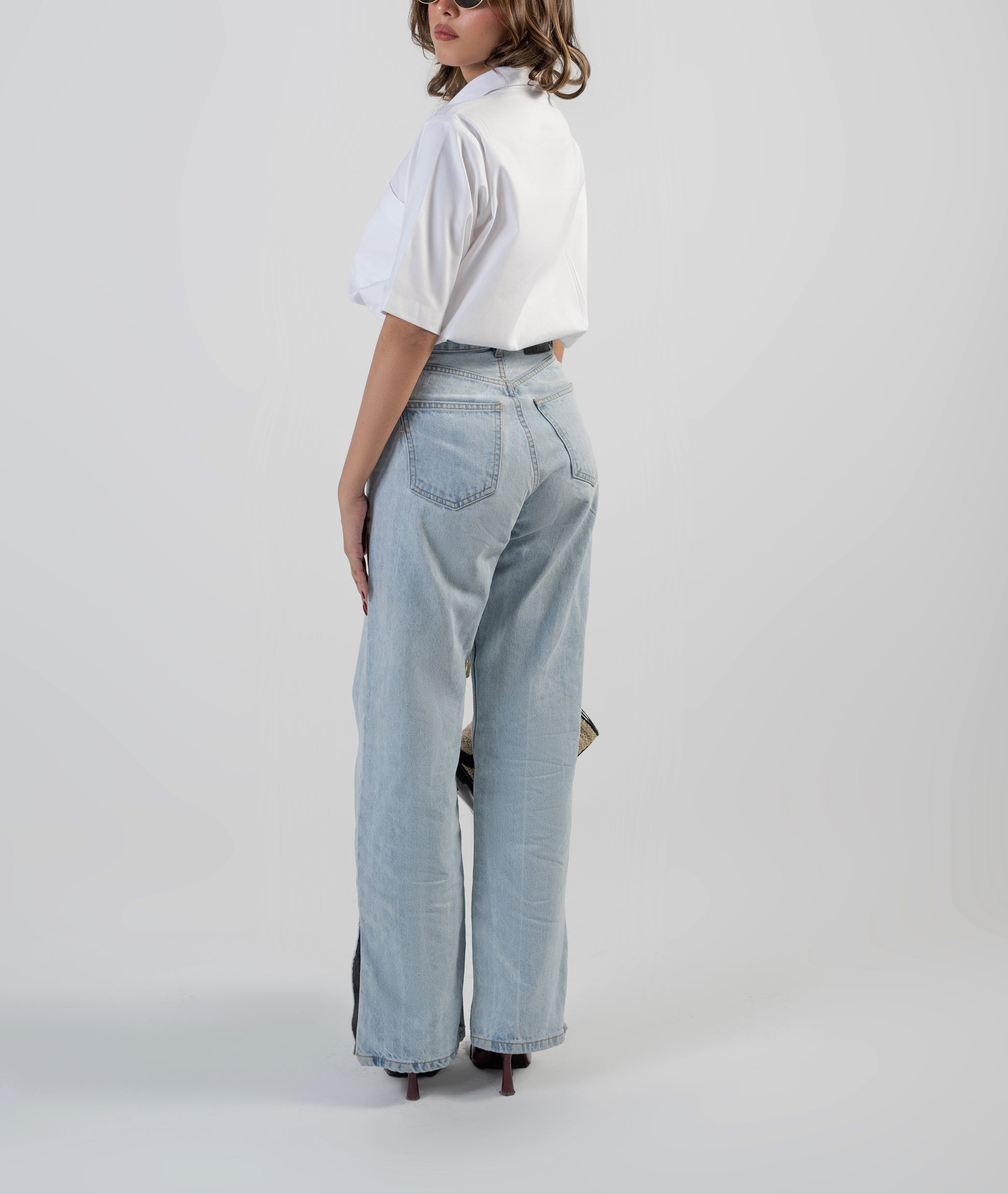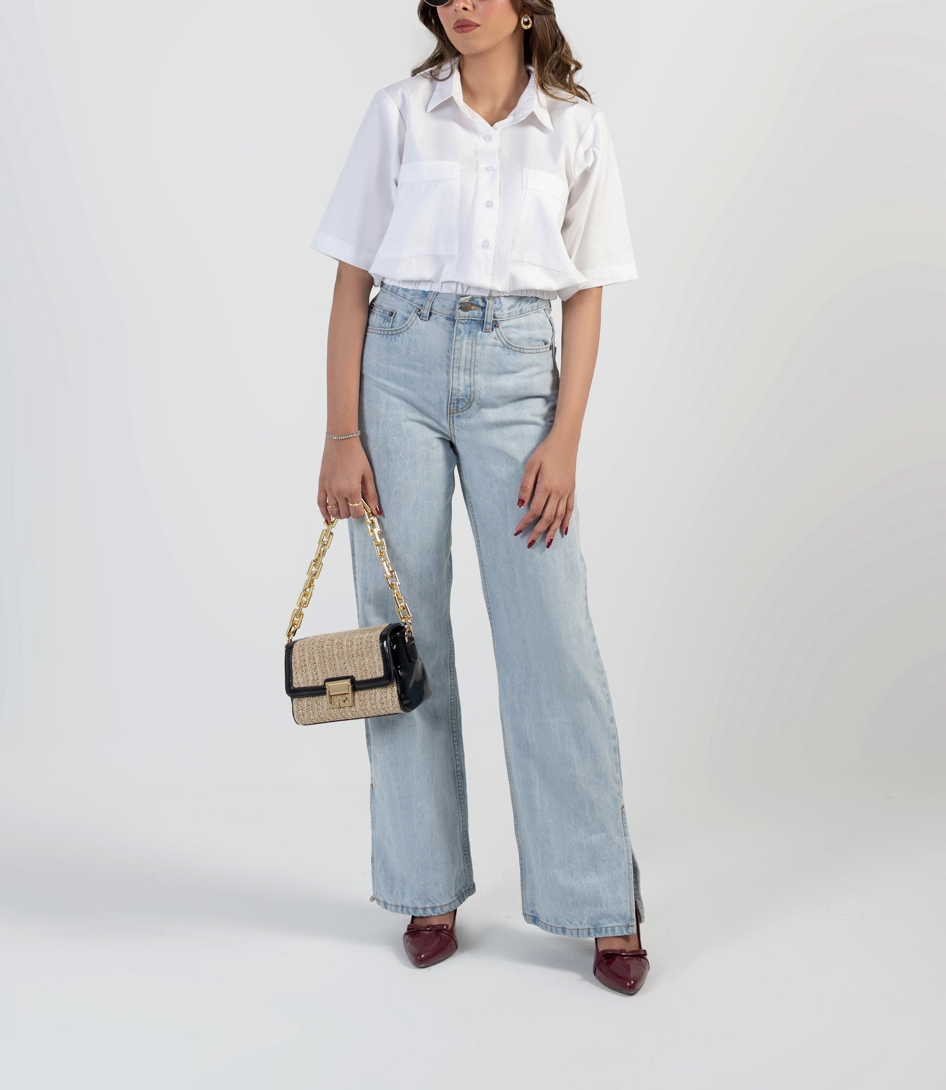 Design Detail: Button down shirt with a notch collar and elastic at the bottom.