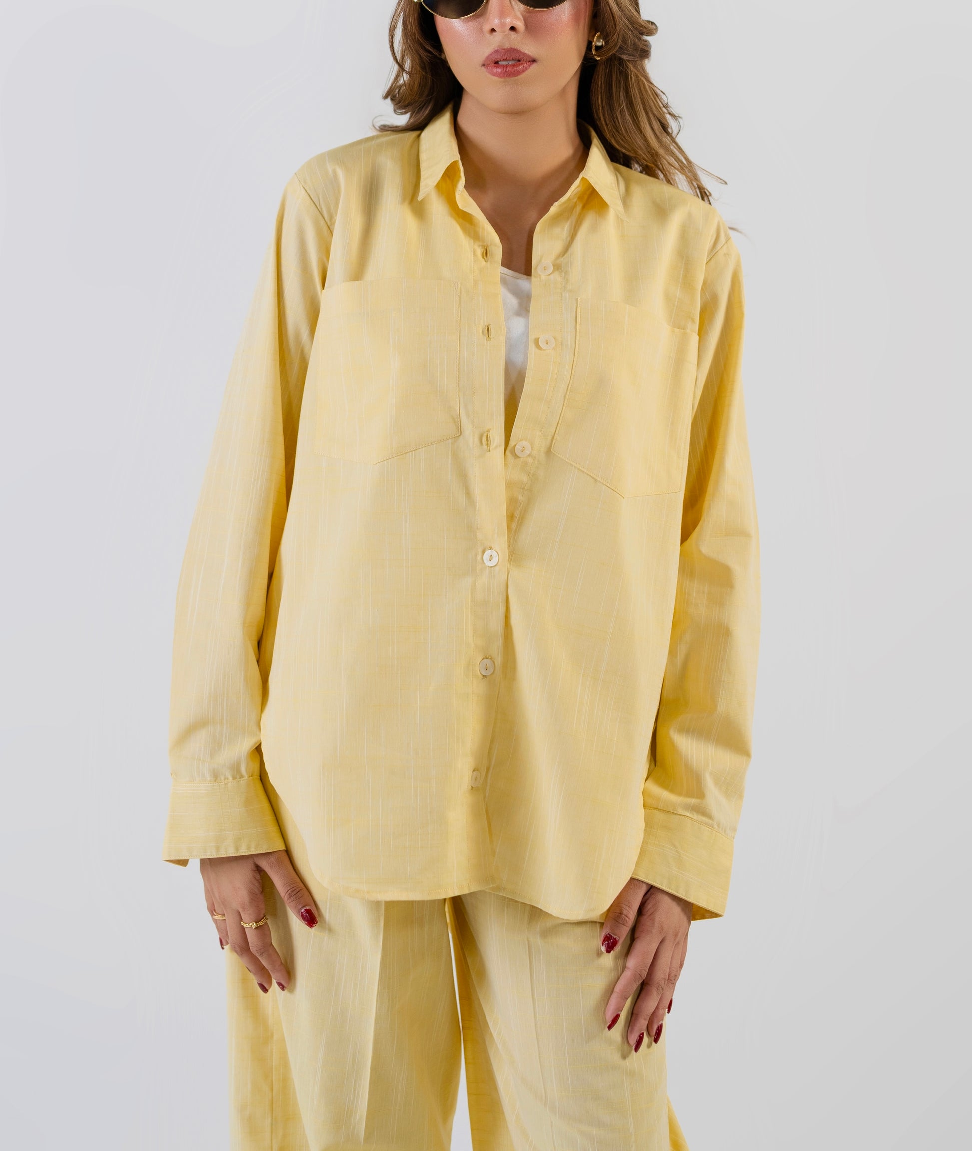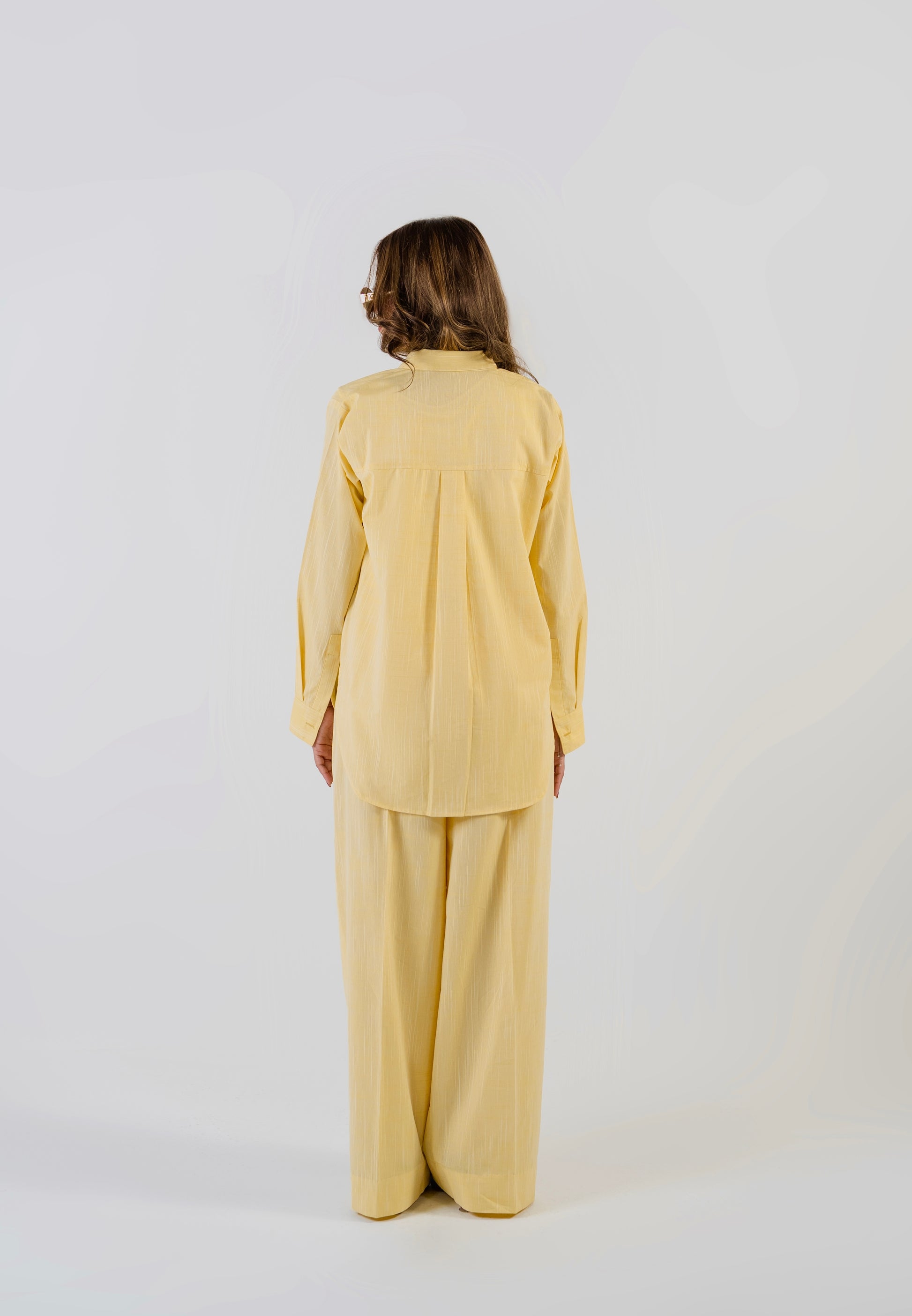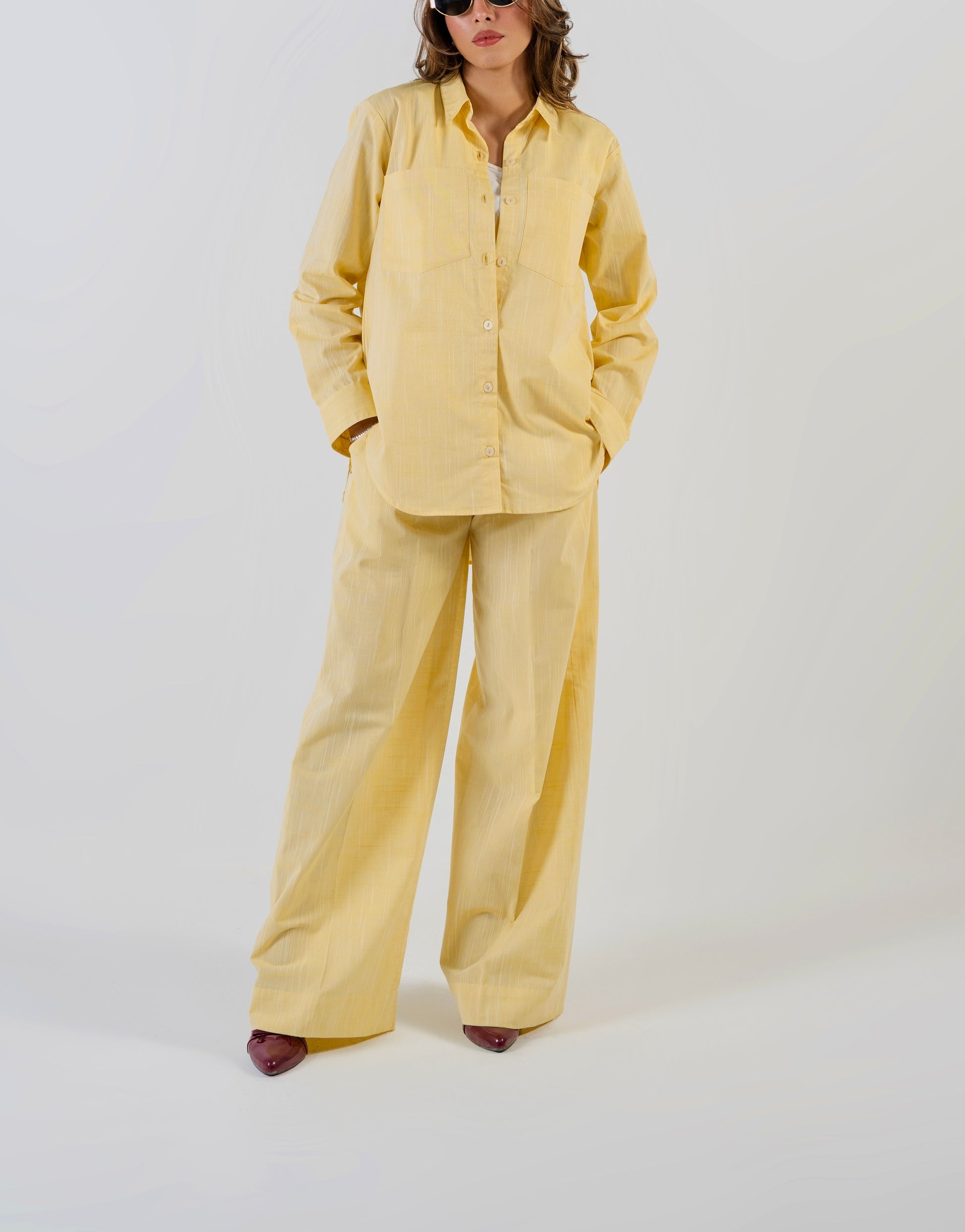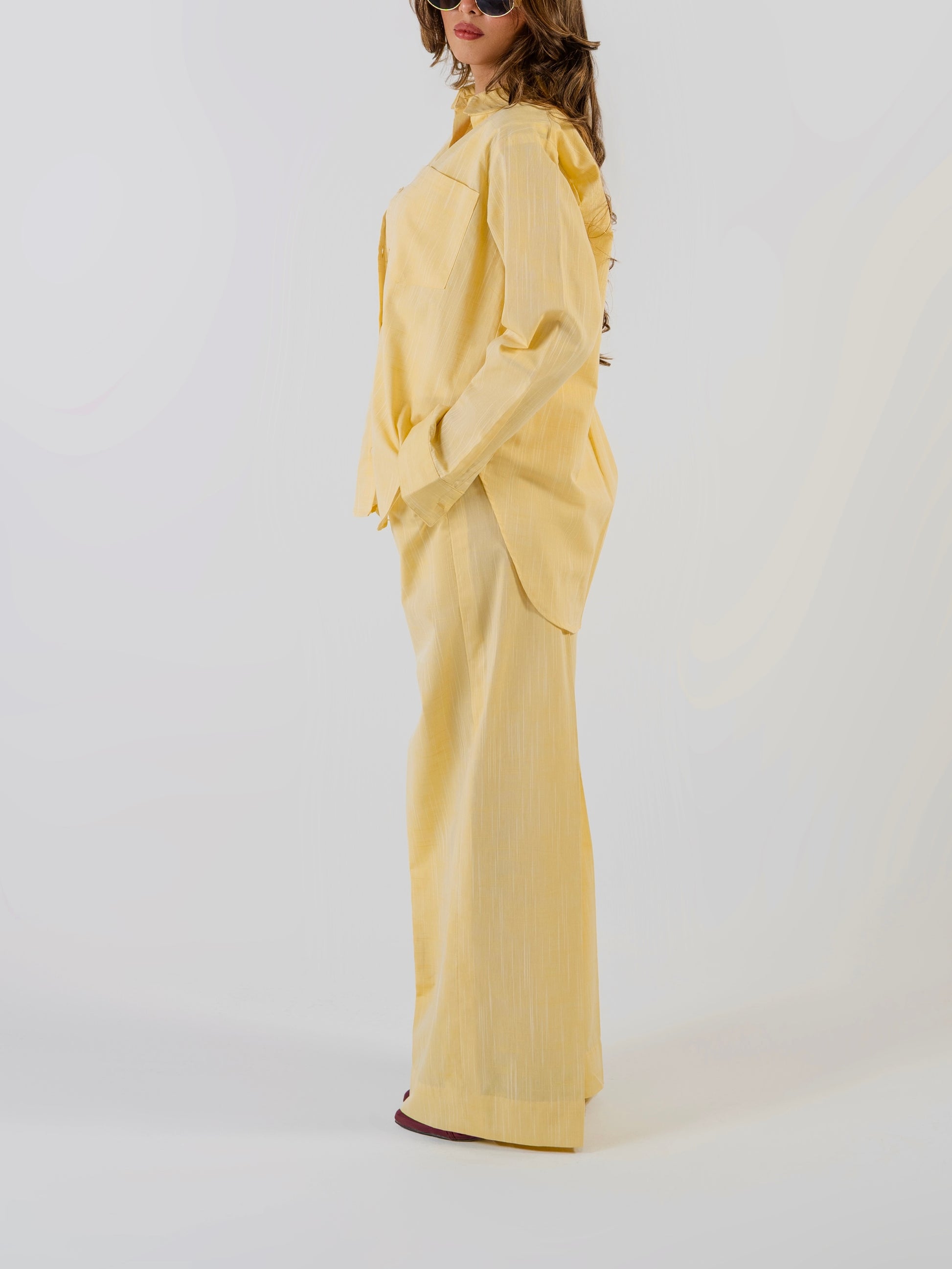 Design Detail: 2 Piece, button down shirt and high waist trousers with half elasticated waistband, front belt, with side pockets